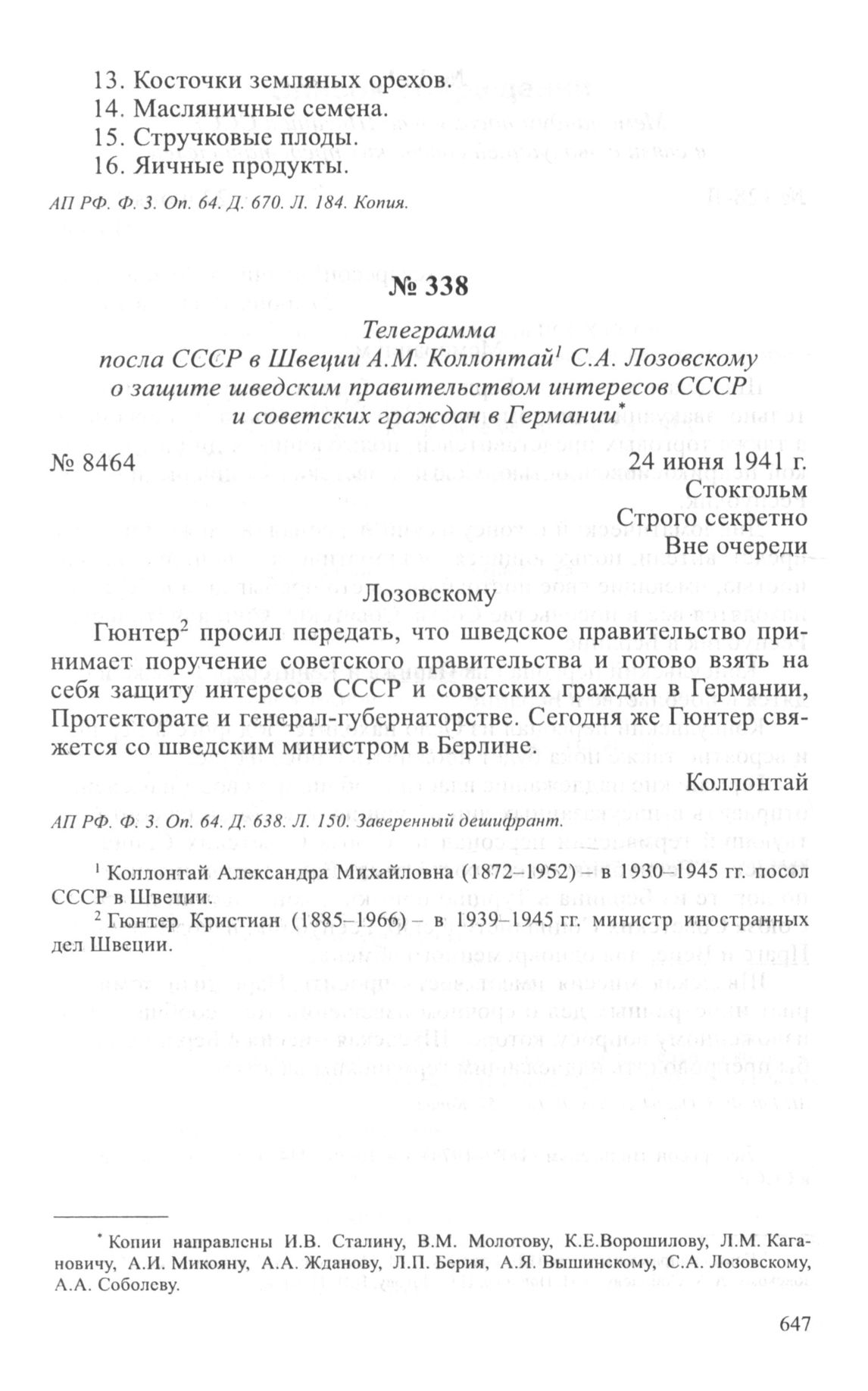 Телеграмма посла СССР в Швеции А.М. Коллонтай С.А. Лозовскому о защите шведским правительством интересов СССР и советских граждан в Германии. 24 июня 1941 г. // АП РФ. Ф. 3. Oп. 64. Д. 638. Л. 150. Заверенный дешифрант.
