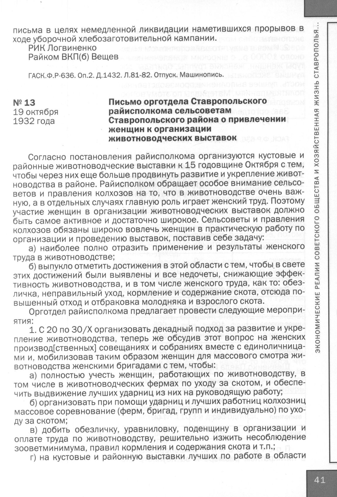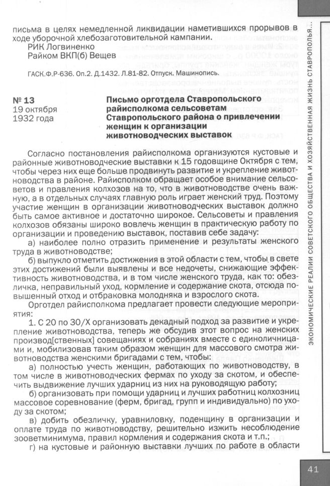 Письмо орготдела Ставропольского райисполкома сельсоветам Ставропольского района о привлечении женщин к организации животноводческих выставок. 19 октября 1932 года