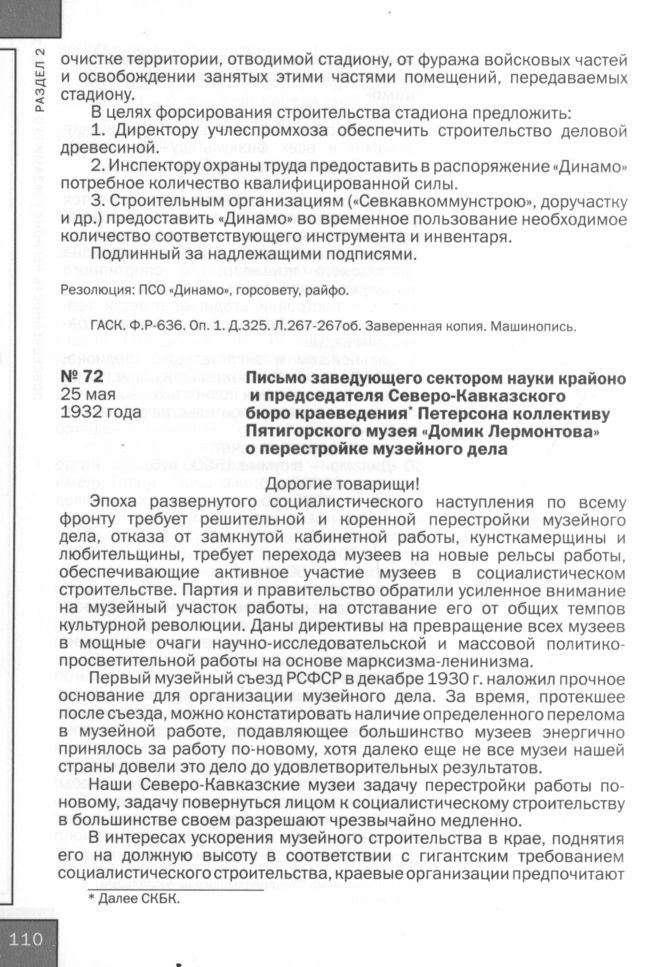Письмо заведующего сектором науки крайоно и председателя Северо-Кавказского бюро краеведения Петерсона коллективу Пятигорского музея «Домик Лермонтова» о перестройке музейного дела. 25 мая 1932 года