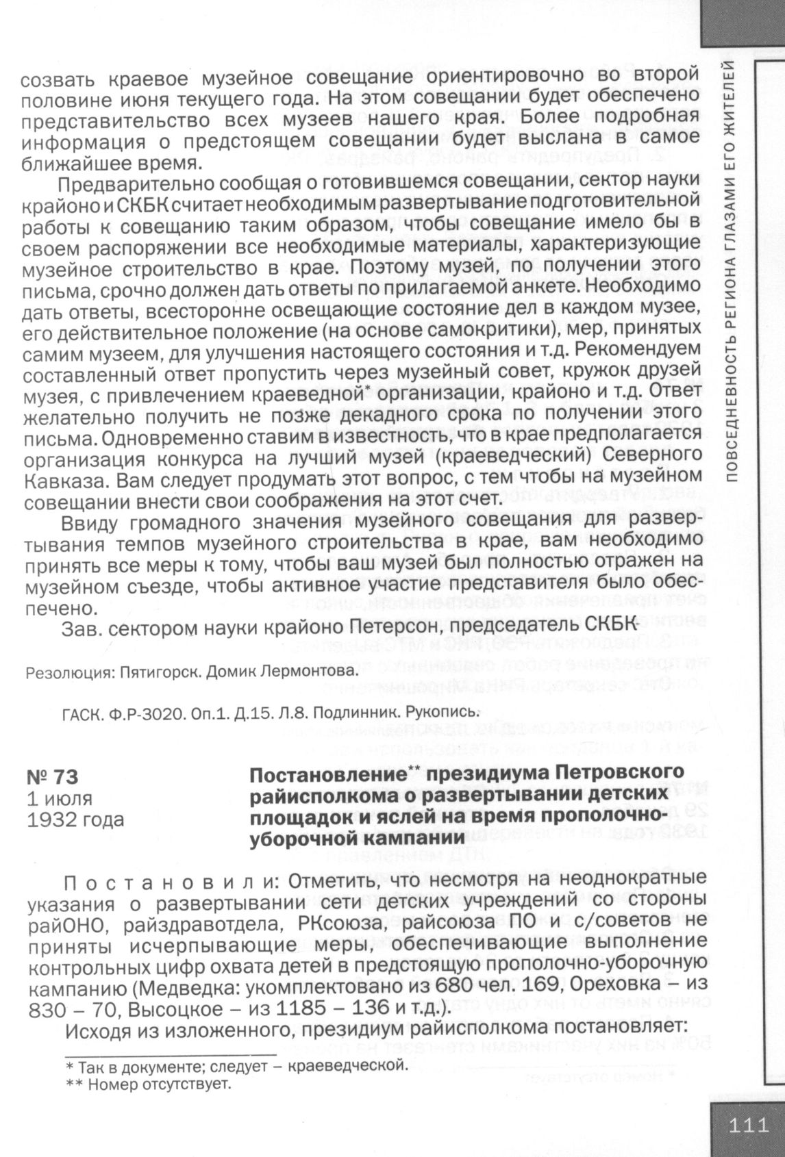 Постановление президиума Петровского райисполкома о развертывании детских площадок и яслей на время прополочно уборочной кампании. 1 июля 1932 года