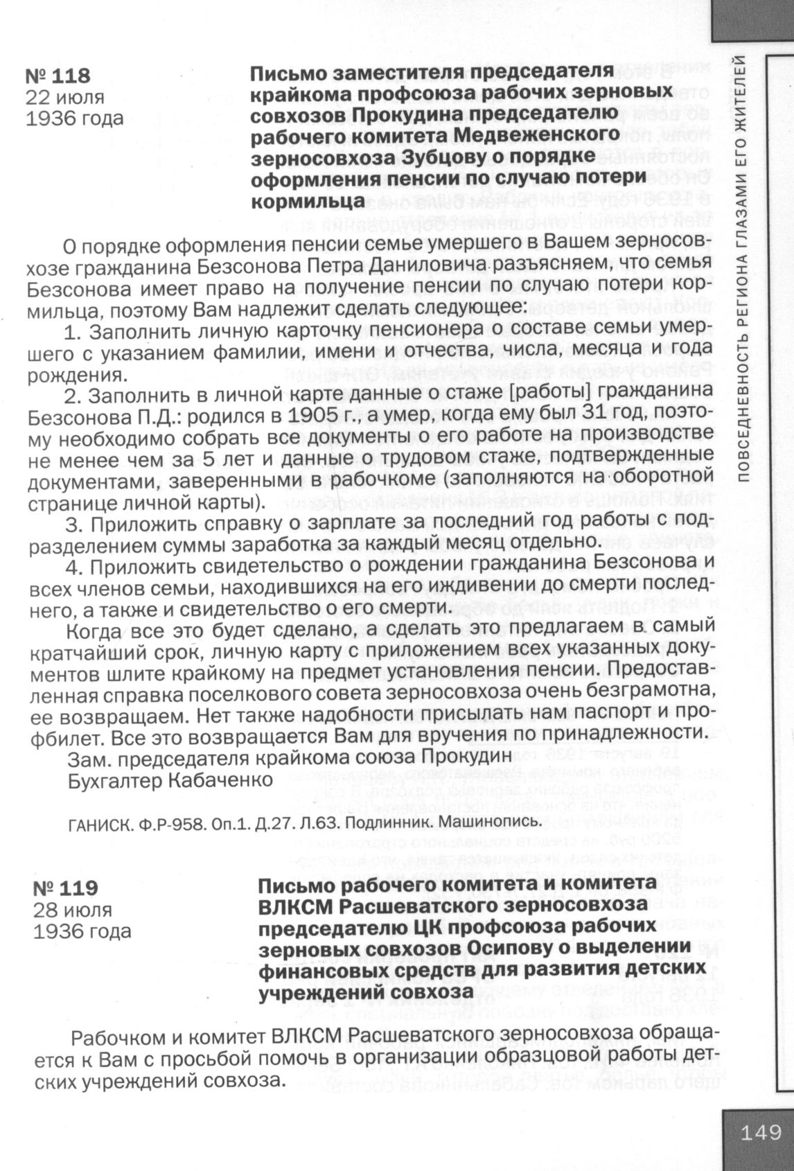 Письмо заместителя председателя крайкома профсоюза рабочих зерновых совхозов Прокудина председателю рабочего комитета Медвеженского зерносовхоза Зубцову о порядке оформления пенсии по случаю потери кормильца. 22 июля 1936 года // ГАНИСК. Ф. Р-958. Оп. 1. Д. 27. Л. 63. Подлинник. Машинопись.
