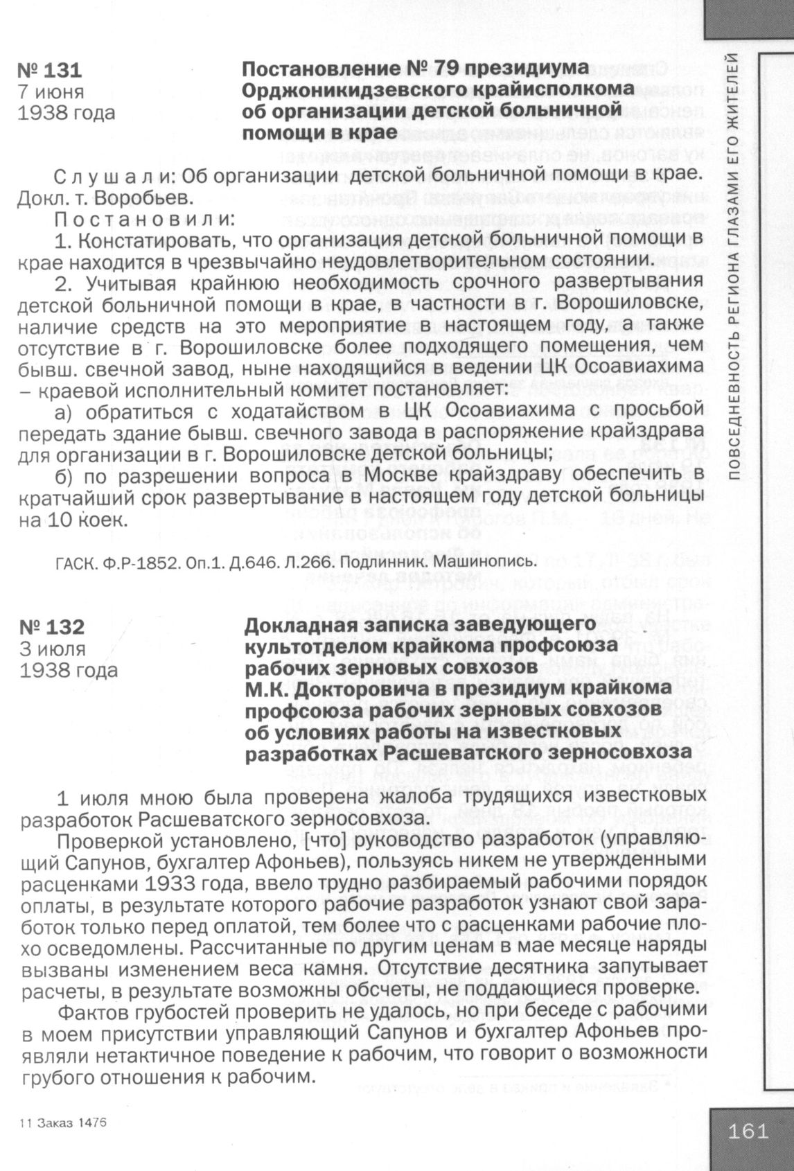 Постановление № 79 президиума Орджоникидзевского крайисполкома об организации детской больничной помощи в крае. 7 июня 1938 года // ГАСК. Ф. Р-1852. Оп. 1. Д. 646. Л. 266. Подлинник. Машинопись.
