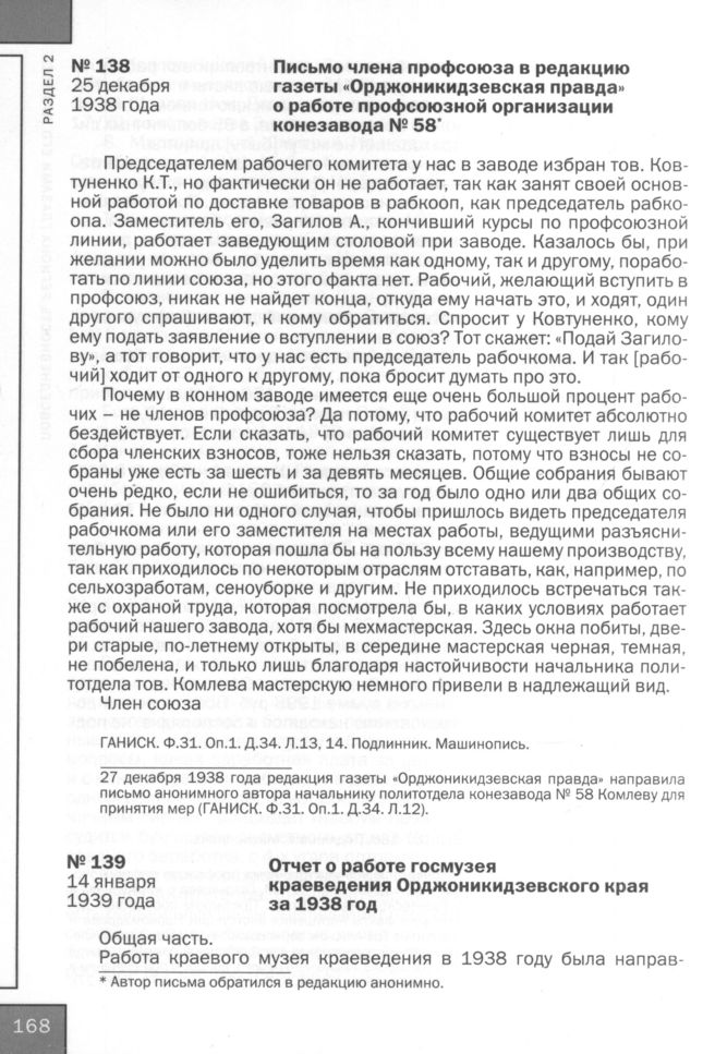 Письмо члена профсоюза в редакцию газеты «Орджоникидзевская правда» о работе профсоюзной организации конезавода № 58. 25 декабря 1938 года // ГАНИСК. Ф. 31. Оп. 1. Д. 34. Л. 13,14. Подлинник. Машинопись.