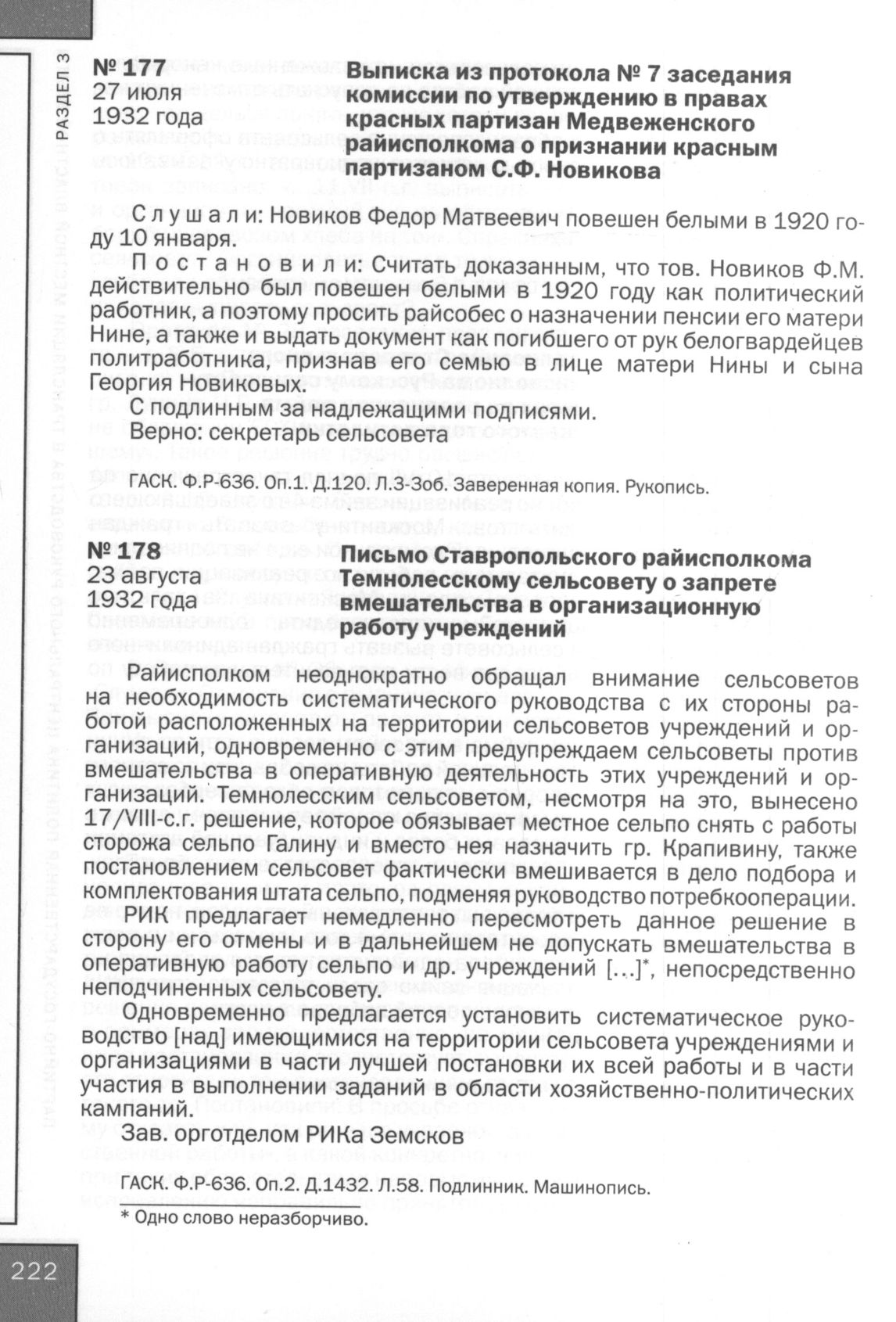 Письмо Ставропольского райисполкома Темнолесскому сельсовету о запрете вмешательства в организационную работу учреждений. 23 августа 1932 года // ГАСК. Ф. Р-636. Oп. 2. Д. 1432. Л. 58. Подлинник. Машинопись.