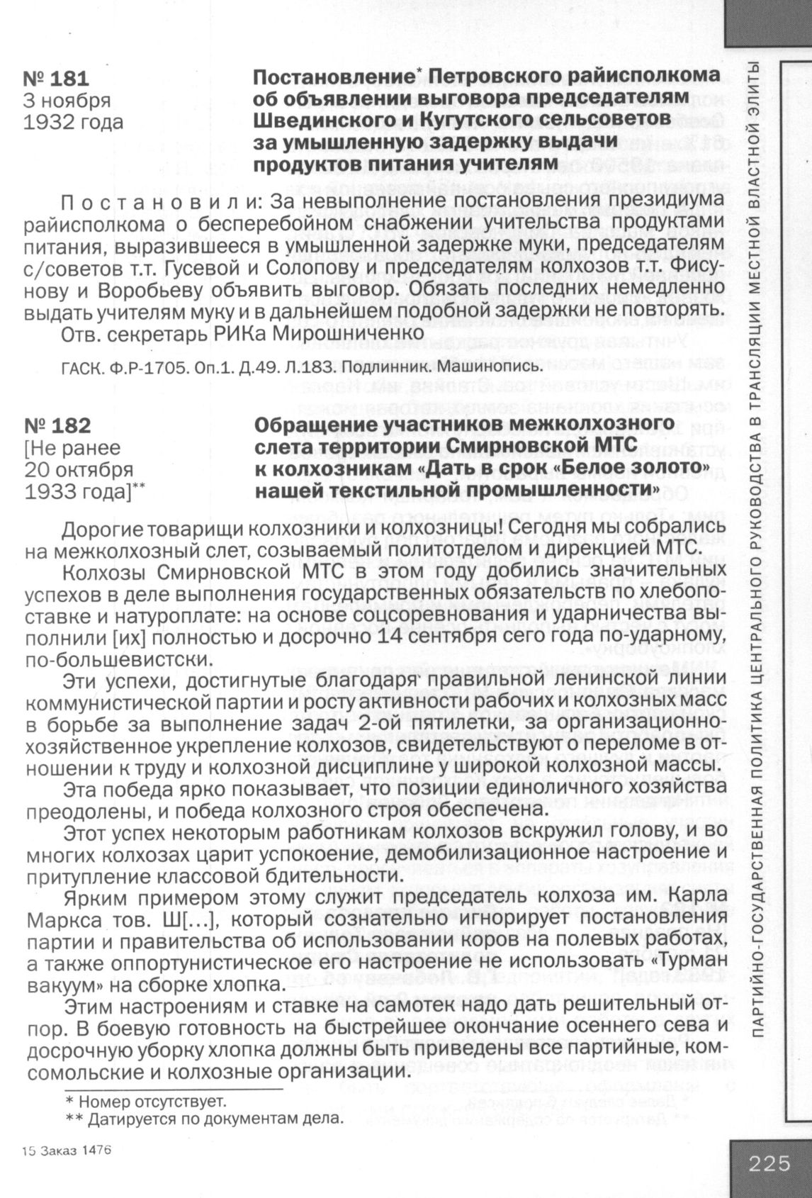 Обращение участников межколхозного слета территории Смирновской МТС к колхозникам «Дать в срок «Белое золото» нашей текстильной промышленности». [Не ранее 20 октября 1933 года] // ГАНИСК. Ф. 32. Оп. 1. Д. 12. Л. 6-8. Подлинник. Машинопись.
