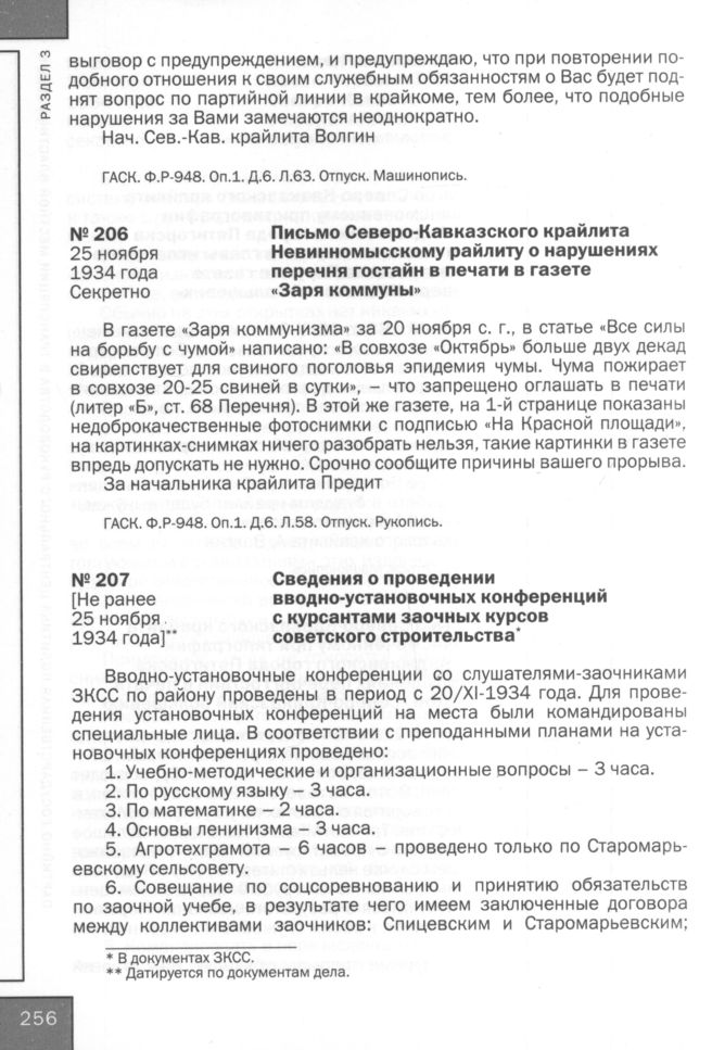 Письмо Северо-Кавказского крайлита Невинномысскому райлиту о нарушениях перечня гостайн в печати в газете «Заря коммуны». 25 ноября 1934 года // ГАСК. Ф. Р-948. Оп. 1. Д. 6. Л. 58. Отпуск. Рукопись.