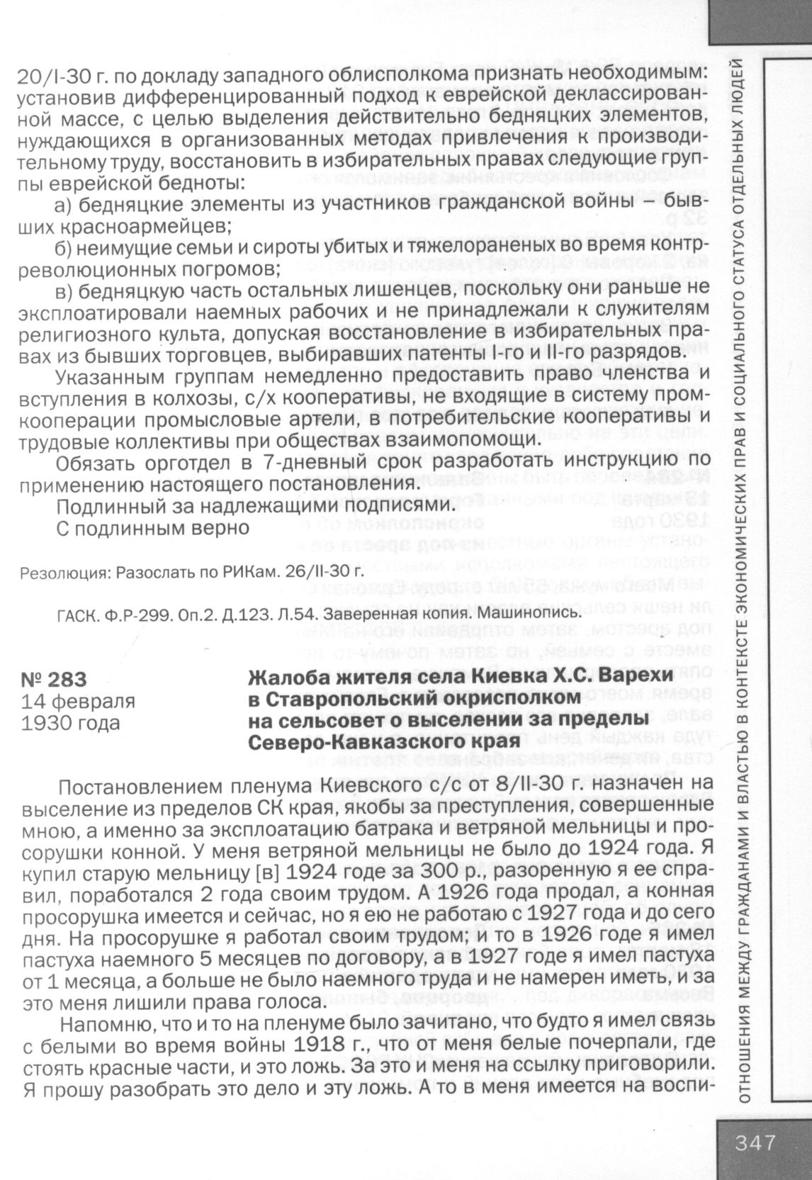 Жалоба жителя села Киевка Х.С. Варехи в Ставропольский окрисполком на сельсовет о выселении за пределы Северо-Кавказского края. 14 февраля 1930 года