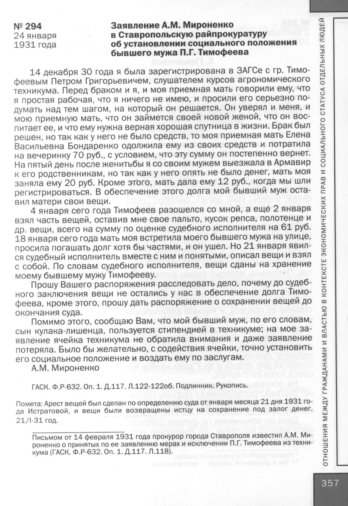 Заявление А.М. Мироненко в Ставропольскую райпрокуратуру об установлении социального положения бывшего мужа П.Г. Тимофеева. 24 января 1931 года // ГАСК. Ф. Р-632. Oп. 1. Д. 117. Л. 122-122об. Подлинник. Рукопись.