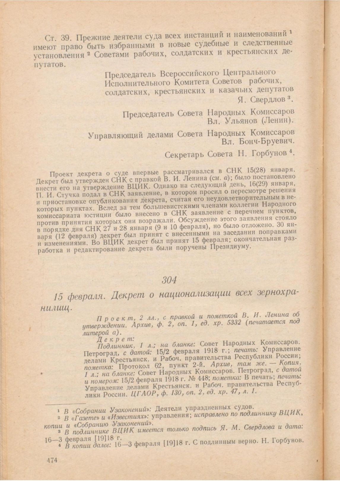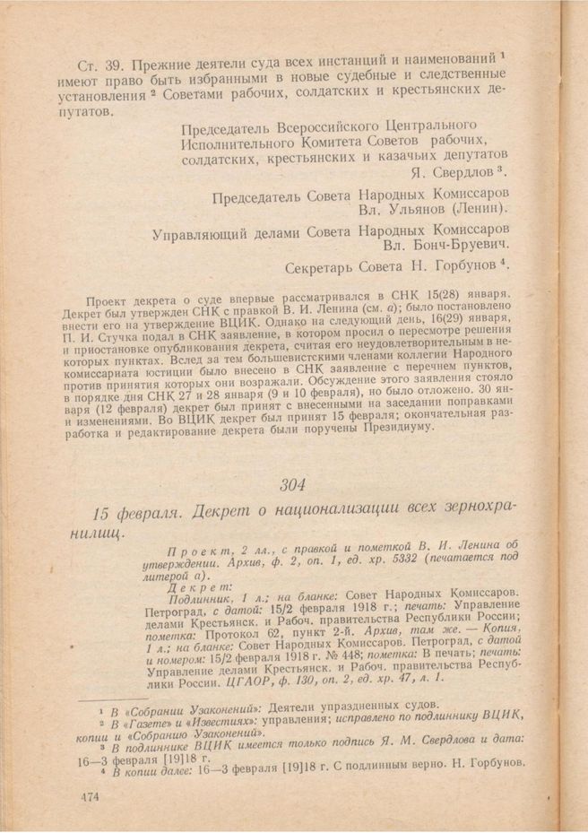 15 февраля. Декрет а национализации всех зернохранилищ // П р о е к т , 2 лл., с правкой и пометкой В. И. Ленина об утверждении. Архив, ф. 2, оп. 1, ед. хр. 5332 (печатается под литерой а). Д е к р е т : Подлинник, 1 л.; на бланке: Совет Народных Комиссаров. Петроград, с датой: 15/2 февраля 1918 г .; печать: У правление делами Крестьянск, и Рабоч, правительства Республики России; пометка: Протокол 62, пункт 2-й. Архив, там же. — Копия, 1 л.: на бланке: Совет Народных Комиссаров. Петроград, с датой и номером: 15/2 февраля 1918 г. № 448; пометка: В печать; печать: У правление делами Крестьянск, и Рабоч. правительства Республики России. ЦГАОР, ф. 130, оп. 2, ед. хр. 47, л. 1. «Газета» № 27, 19 февраля (печатается под литерой б); «Известия» №№ 27 и 28, 17 и 19 февраля; «Собрание Узаконений» № 25, ст. 344.