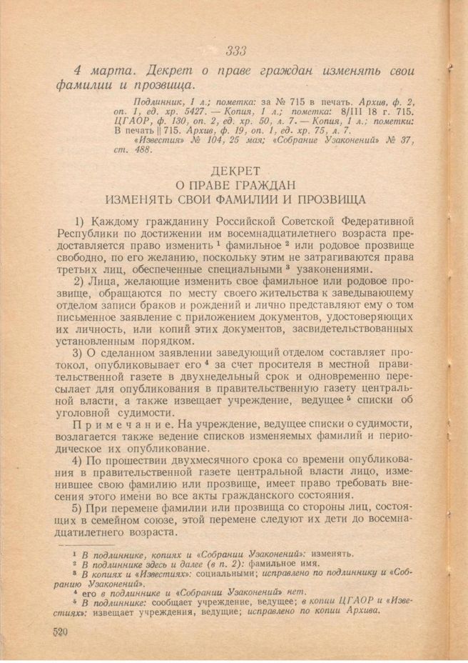 Главная Серия «Экономическая история. Документы, исследования, переводы» Декреты советской власти в 18 т. Декреты Советской власти. Т. I. 25 октября 1917 г. – 16 марта 1918 г. Документы 4 марта. Декрет о праве граждан изменять свои фамилии и прозвища