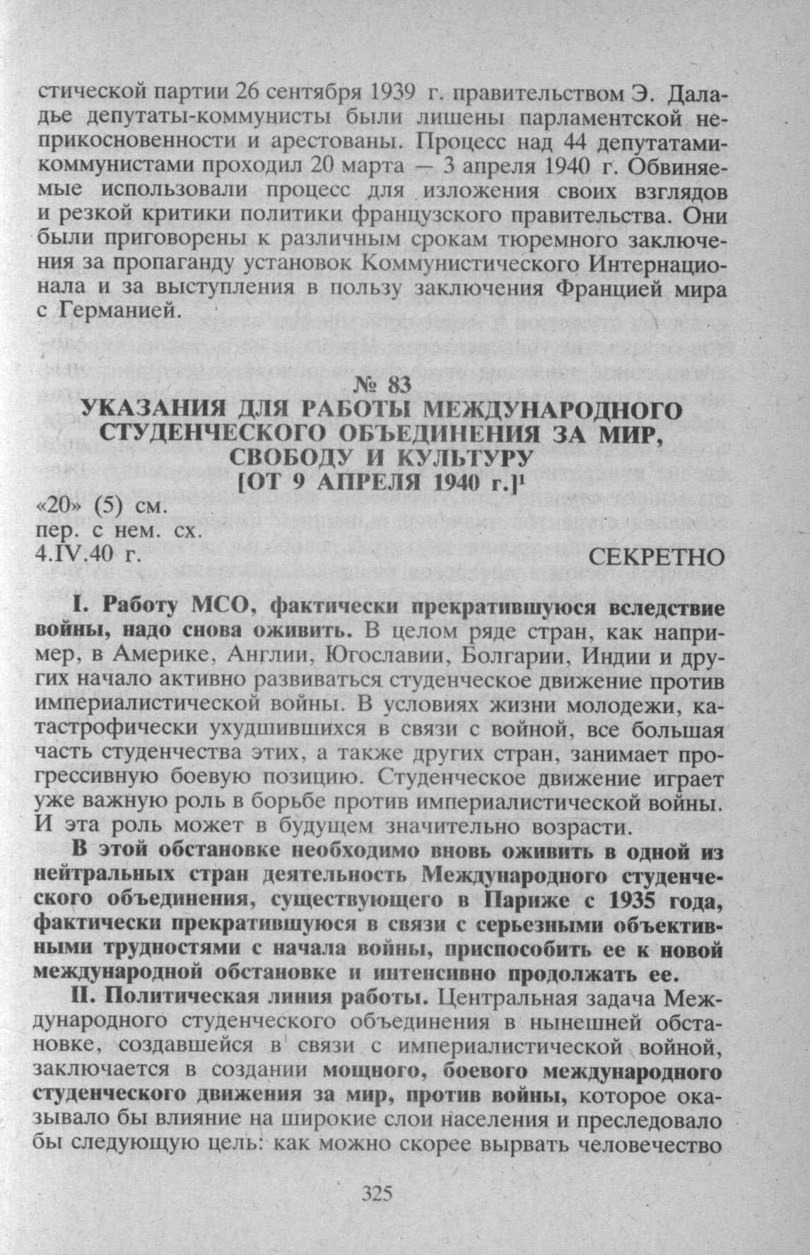 Указания для работы Международного студенческого объединения за мир, свободу и культуру [от 9 апреля 1940 г.] // РЦХИДНИ. Ф. 495, Оп. 18, Д. 1319, Л. 102-107. Копия, машинопись, русский язык.