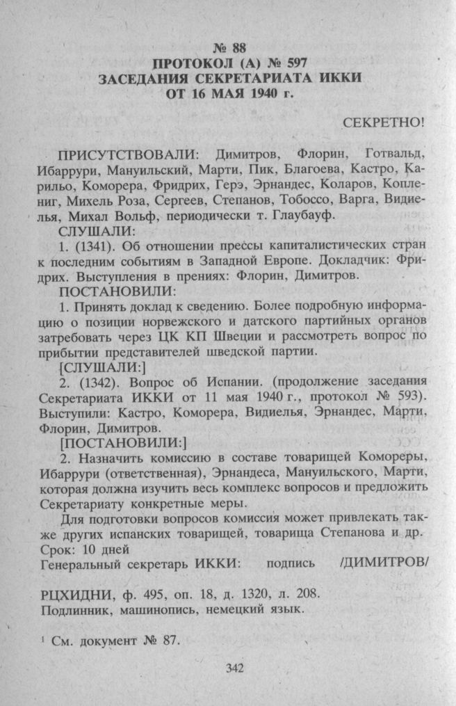 Протокол (А) № 597 заседания Секретариата ИККИ от 16 мая 1940 г. // РЦХИДНИ. Ф. 495, Оп. 18, Д. 1320, Л. 208. Подлинник, машинопись, немецкий язык.