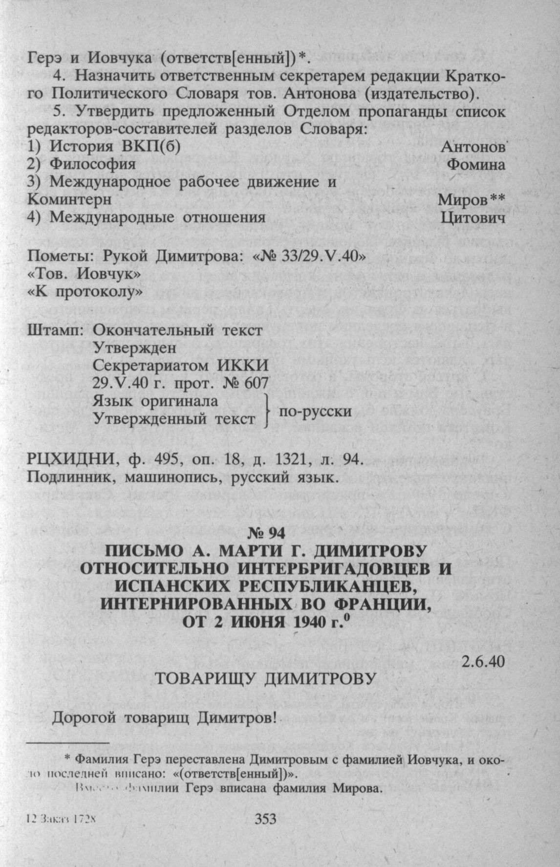 Письмо А. Марти Г. Димитрову относительно интербригадовцев и испанских республиканцев, интернированных во Франции, от 2 июня 1940 г. // РЦХИДНИ. Ф. 495, Оп. 73, Д. 90, Л. 37. Подлинник, машинопись, немецкий язык.