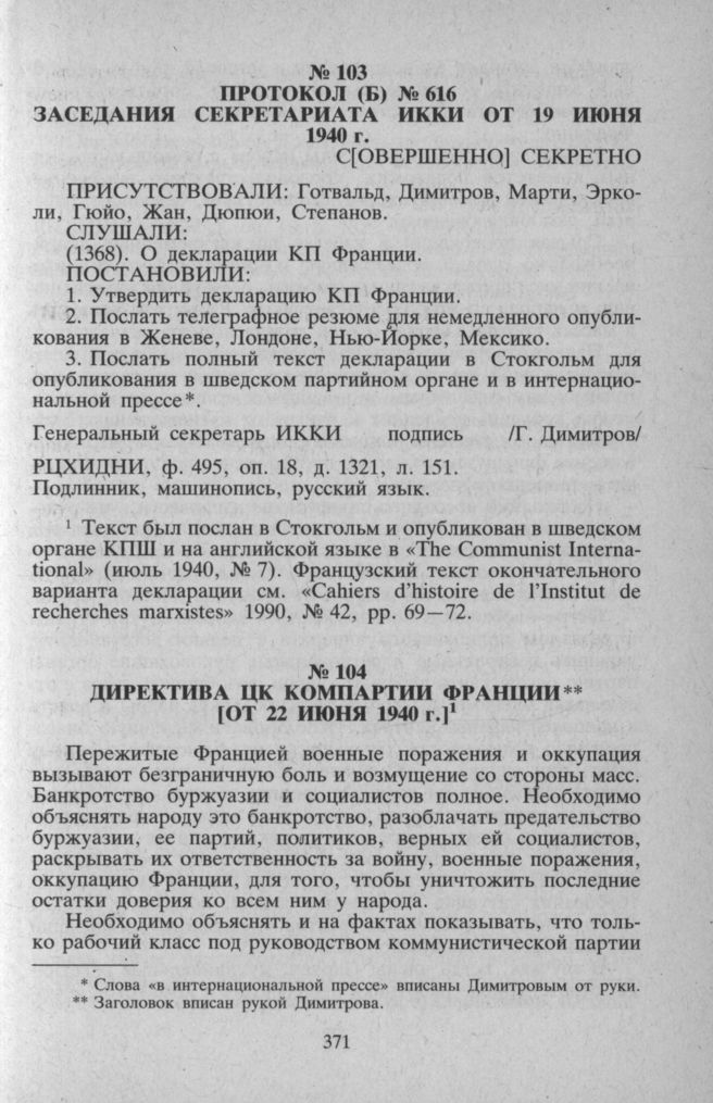Протокол (Б) № 616 заседания Секретариата ИККИ от 19 июня 1940 г. // РЦХИДНИ. Ф. 495, Оп. 18, Д. 1321, Л. 151. Подлинник, машинопись, русский язык.