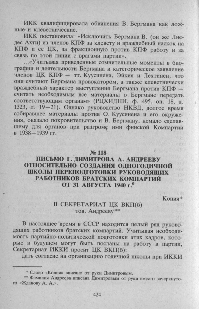 Письмо Г. Димитрова А. Андрееву относительно создания одногодичной школы переподготовки руководящих работников братских компартий от 31 августа 1940 г. // РЦХИДНИ. Ф. 495, Оп. 73, Д. 84, Л. 2-3. Копия, машинопись, русский язык.