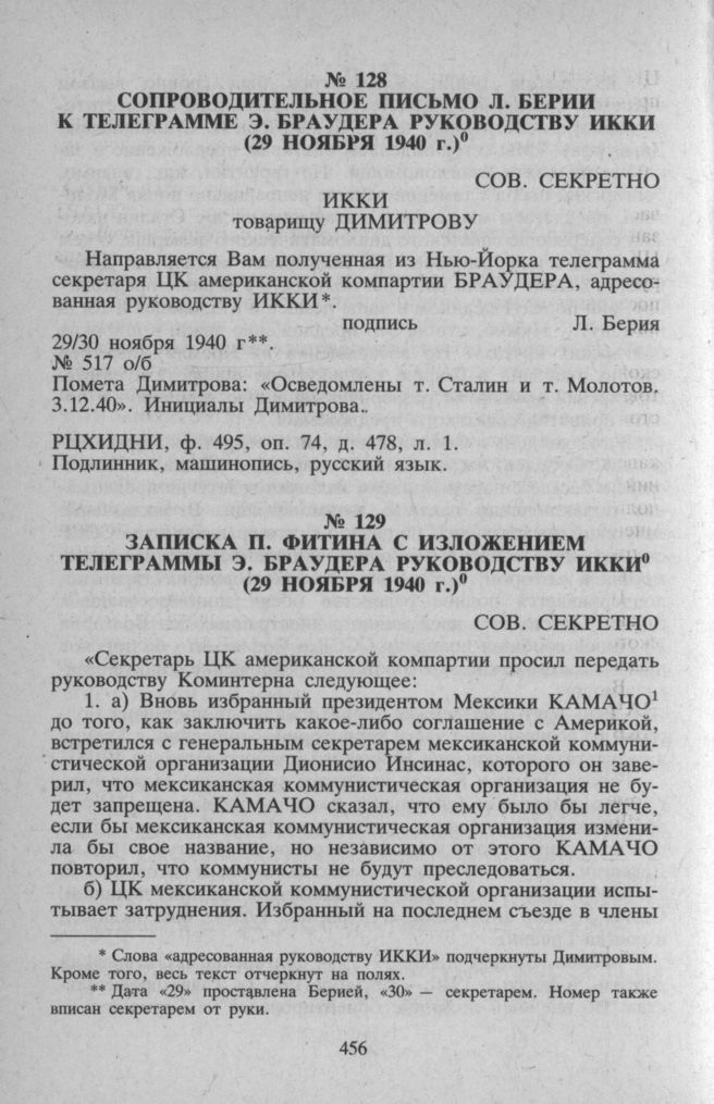 Записка П. Фитина с изложением телеграммы Э. Браудера руководству ИККИ (от 29 ноября 1940 г.) // РЦХИДНИ. Ф. 495, Оп. 74, Д. 478, Л. 2-3. Подлинник, машинопись, русский язык.