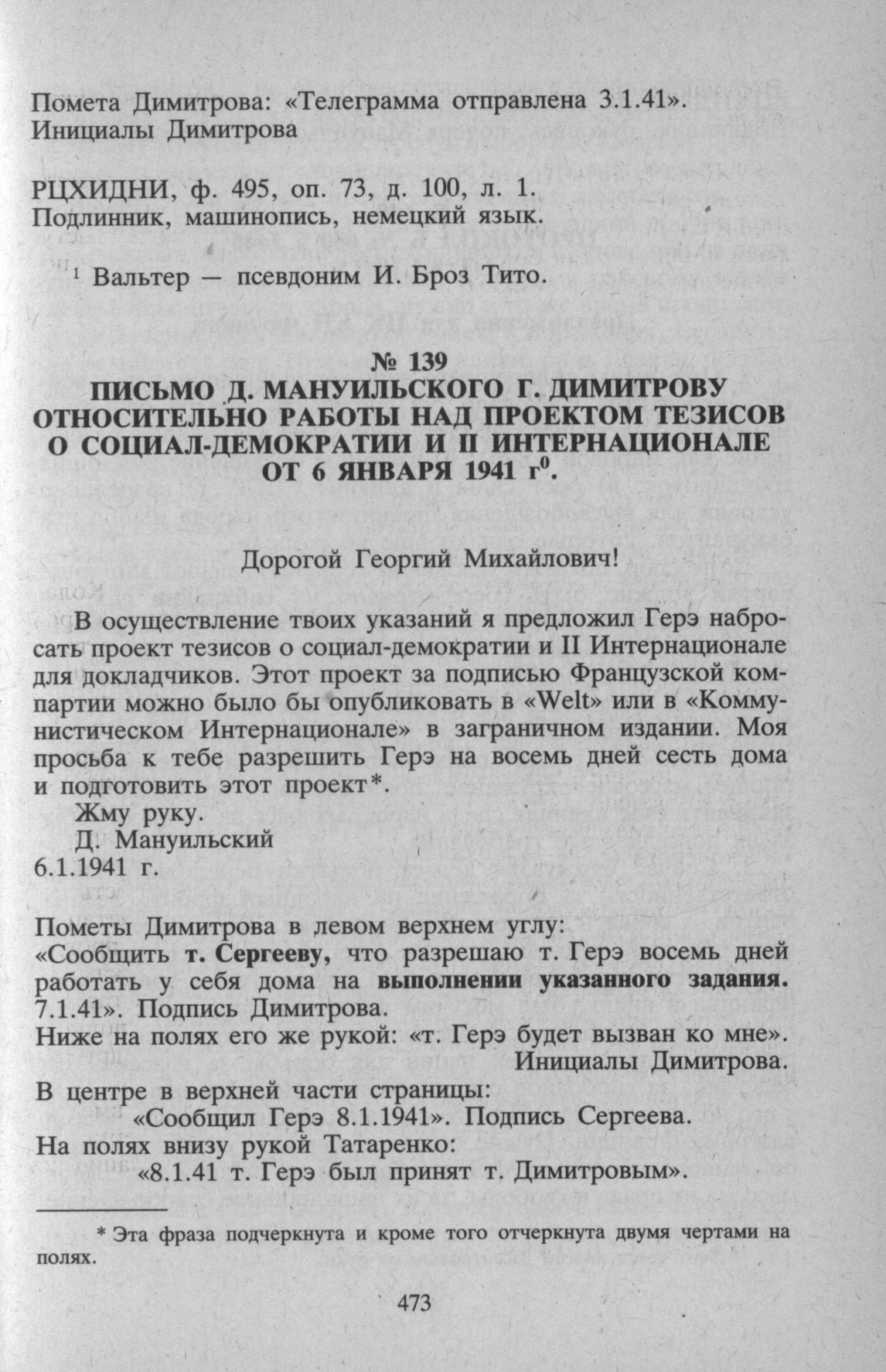Письмо Д. Мануильского Г. Димитрову относительно работы над проектом тезисов о социал-демократии и II Интернационале от 6 января 1941 г. // РЦХИДНИ. Ф. 495, Оп. 73, Д. 104, Л. 11. Подлинник, рукопись, почерк Мануильского, русский язык.