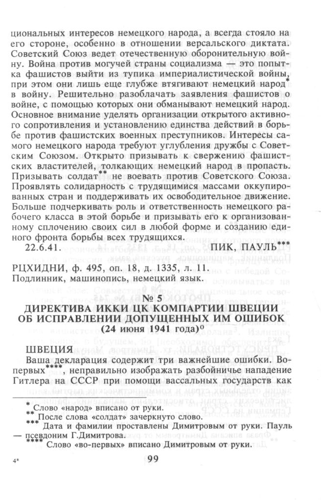 Директива ИККИ ЦК Компартии Швеции об исправлении допущенных им ошибок. 24 июня 1941 г. // РЦХИДНИ. Ф. 495, оп. 18, д. 1335, л. 14. Подлинник, машинопись, русский язык.