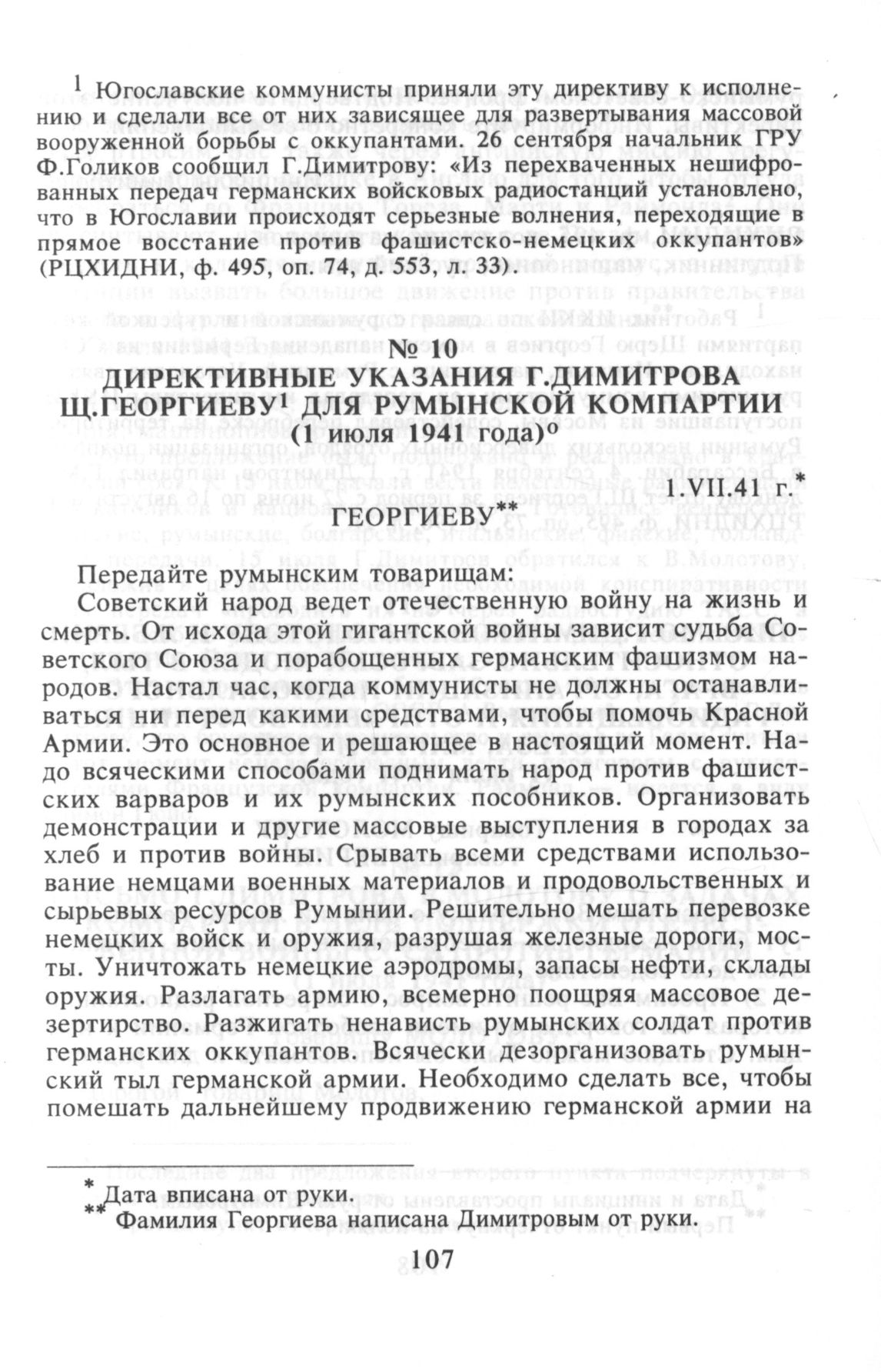 Директивные указания Г.Димитрова Щ.Георгиеву для Румынской Компартии. 1 июля 1941 г. // РЦХИДНИ. Ф. 495, коллекция материалов. Подлинник, машинопись, русский язык.