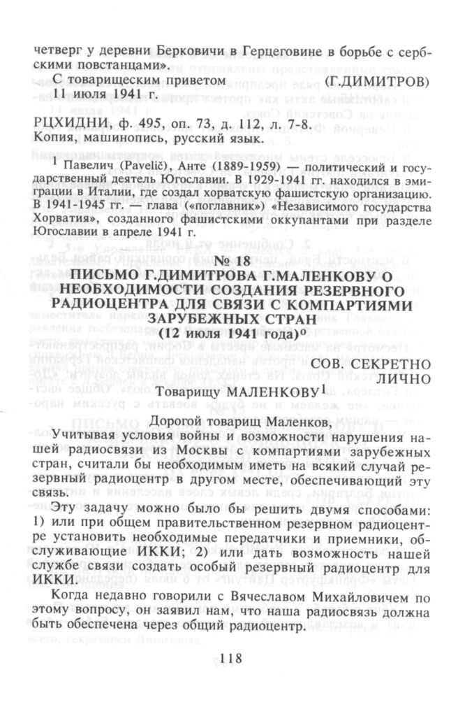 Письмо Г.Димитрова Г.Маленкову о необходимости создания резервного радиоцентра для связи с компартиями зарубежных стран. 12 июля 1941 г. // РЦХИДНИ. Ф. 495, оп. 73, д. 114, л. 8-9. Копия, машинопись, русский язык.