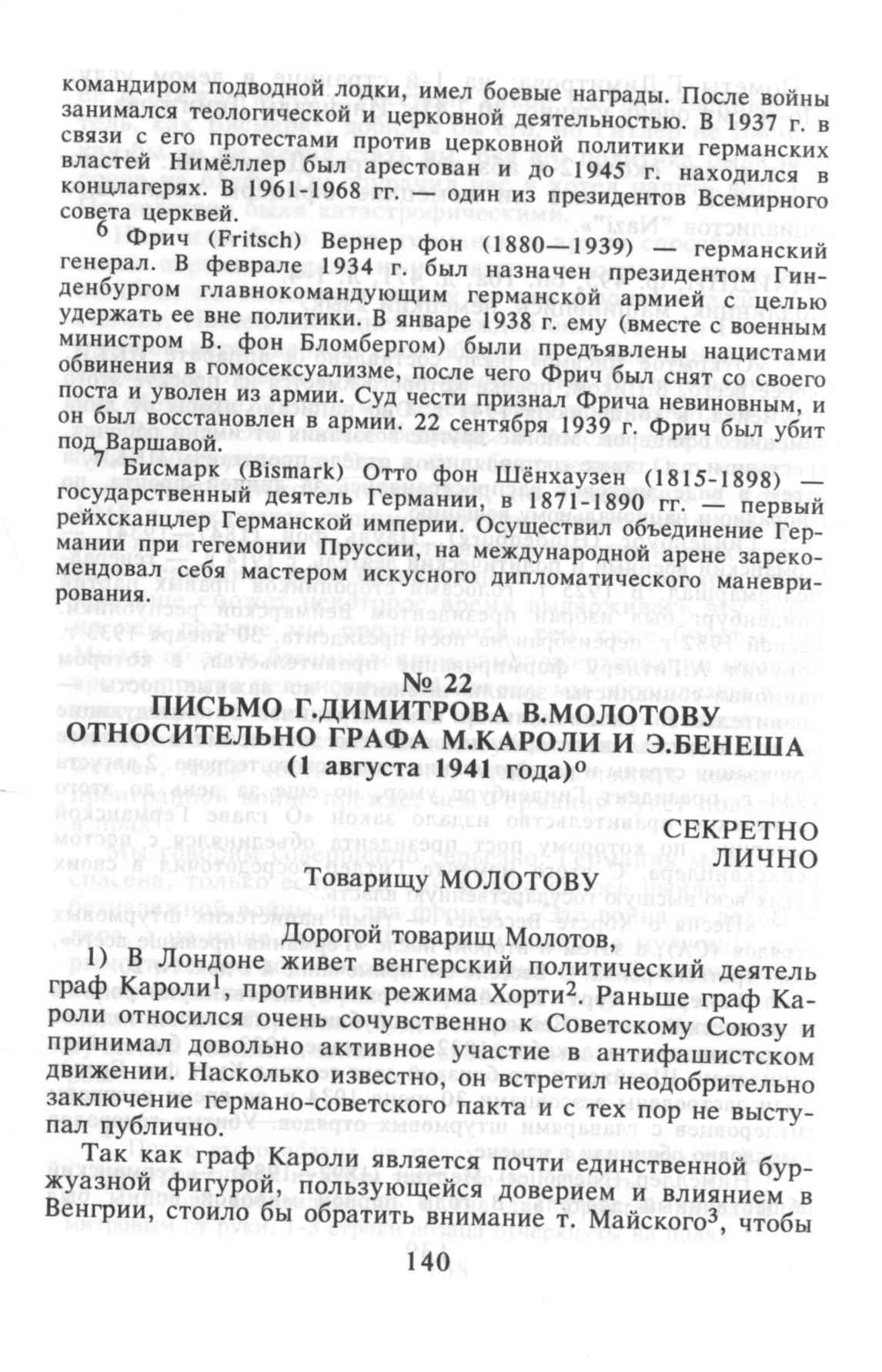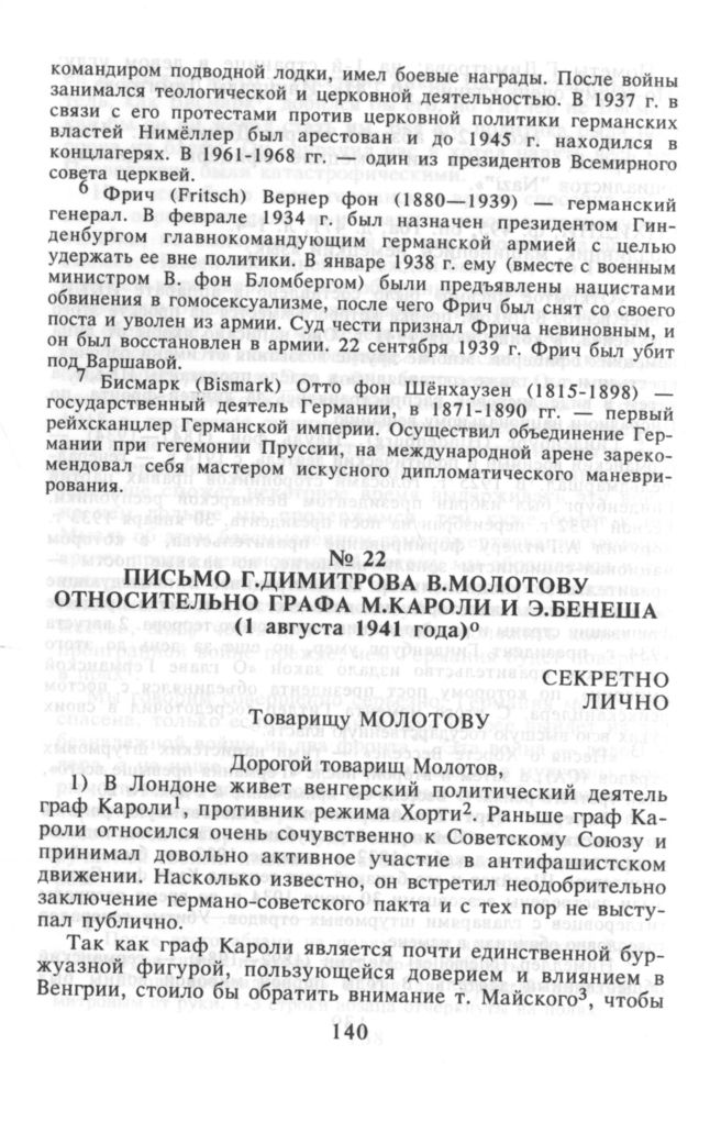 Письмо Г.Димитрова В.Молотову относительно графа М.Кароли и Э.Бенеша. 1 августа 1941 г. // РЦХИДНИ. Ф. 495, оп. 74, д. 111, л. 1-2. Копия, машинопись, русский язык.