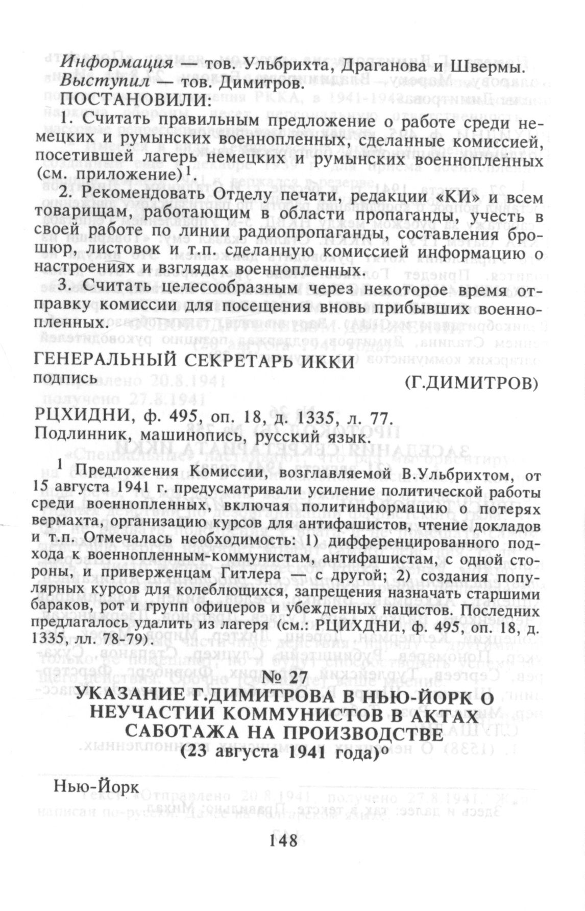Указание Г.Димитрова в Нью-Йорк о неучастии коммунистов в актах саботажа на производстве. 23 августа 1941 г. // РЦХИДНИ. Ф. 495, коллекция материалов. Подлинник, машинопись, английский язык.