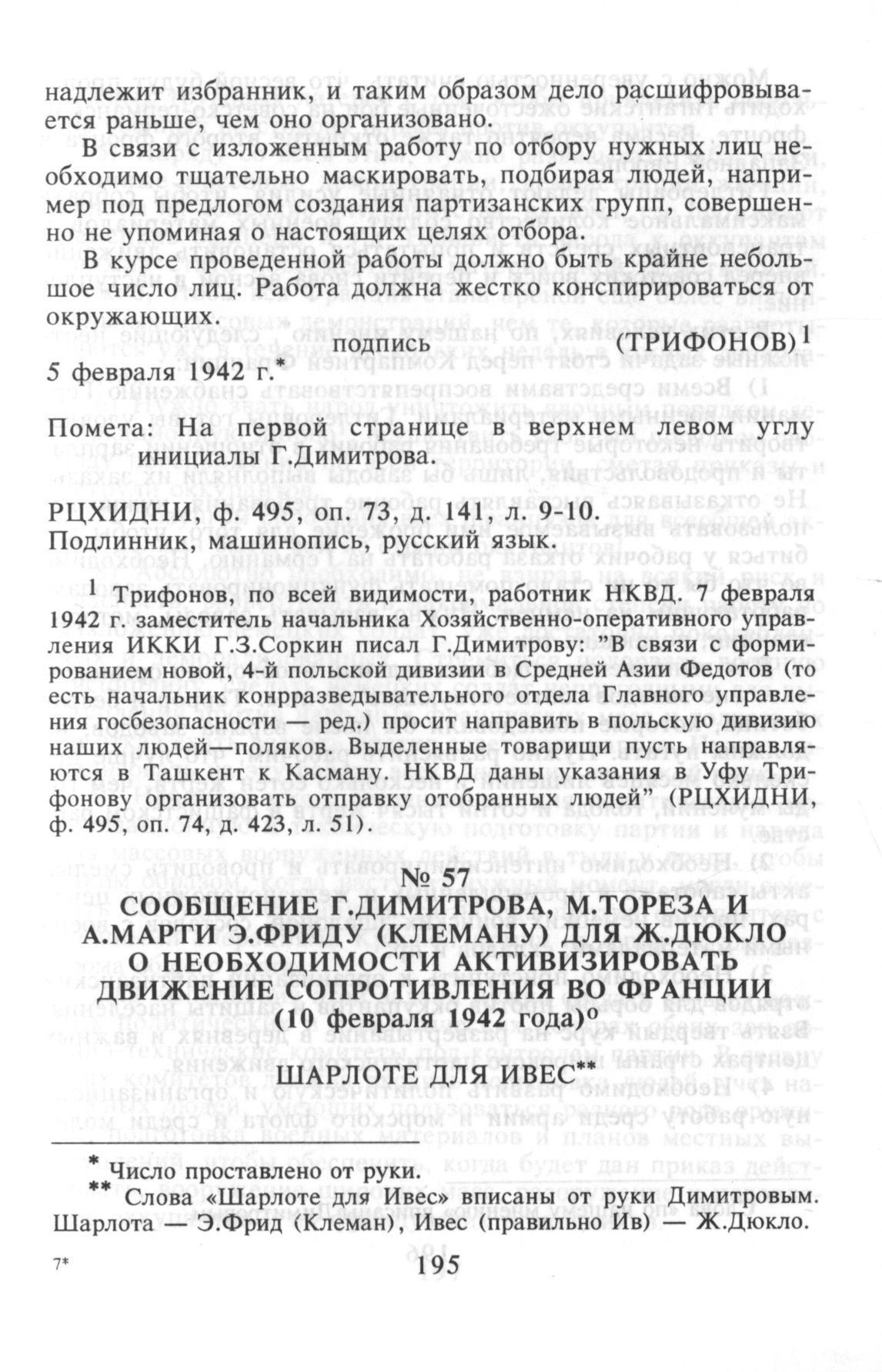 Послание Г.Димитрова, М.Тореза и А.Марти Э.Фриду (Клеману) для Ж.Дюкло о необходимости активизировать движение Сопротивления во Франции. 10 февраля 1942 г. // РЦХИДНИ. Ф. 495, коллекция материалов. Подлинник, машинопись, русский язык.