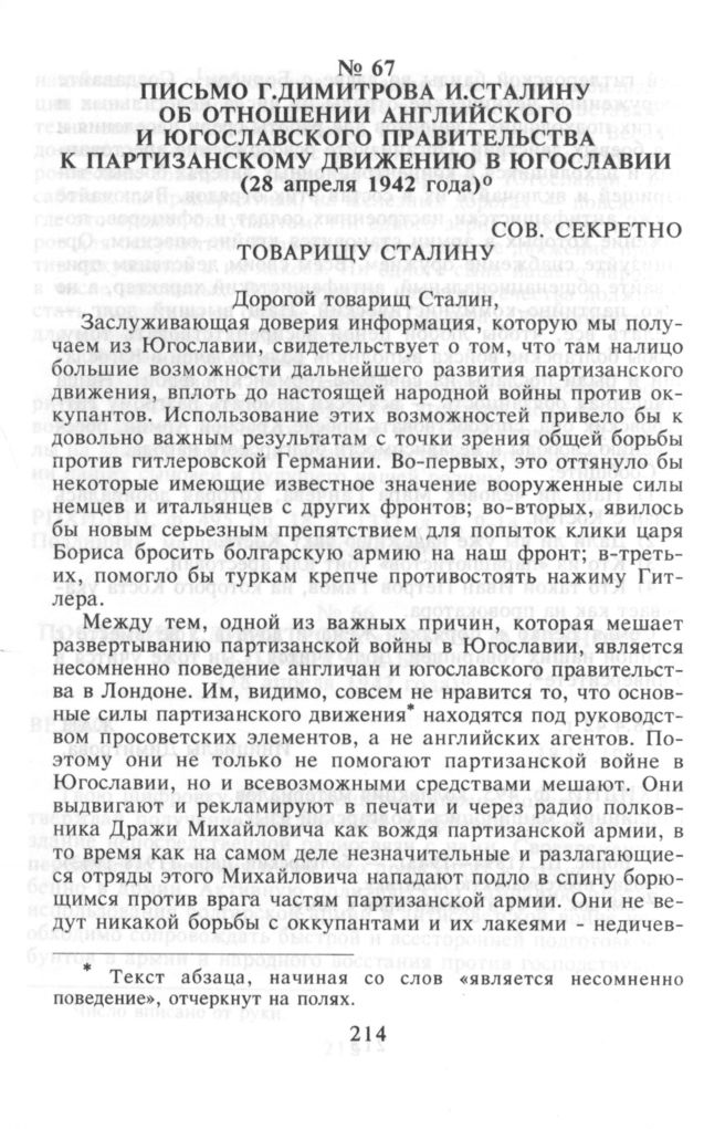 Письмо Г.Димитрова И.Сталину об отношении английского и югославского правительств к партизанскому движению в Югославии. 28 февраля 1942 г. // РЦХИДНИ. Ф. 495, оп. 74, д. 595, л. 20-21. Копия, машинопись, русский язык.