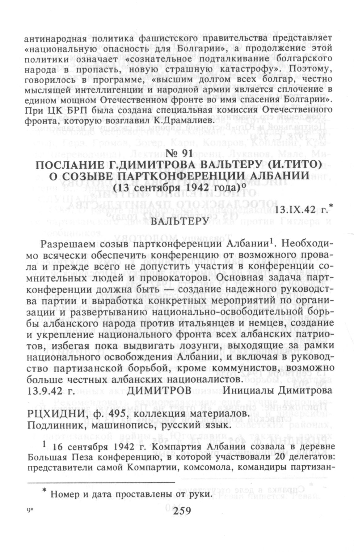 Послание Г.Димитрова Вальтеру (И.Тито) о созыве партконференции в Албании. 13 сентября 1942 г. // РЦХИДНИ. Ф. 495, коллекция материалов. Подлинник, машинопись, русский язык.