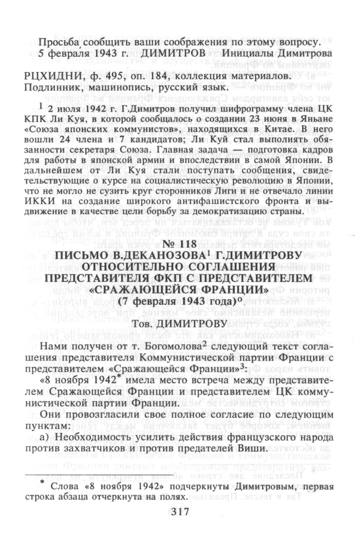 Письмо В.Деканозова Г.Димитрову относительно соглашения представителя ФКП с представителем «Сражающейся Франции». 7 февраля 1943 г. // РЦХИДНИ. Ф. 495, оп. 74, д. 532, л. 3-6. Подлинник, машинопись, русский язык.