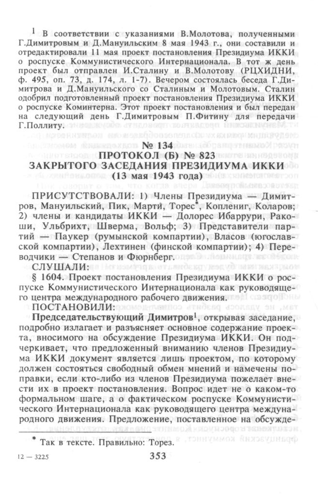 Протокол (Б) № 823 закрытого заседания Президиума ИККИ. 13 мая 1943 г. // РЦХИДНИ. Ф. 495, оп. 18, д. 1340, л. 78-84. Подлинник, машинопись, русский язык.