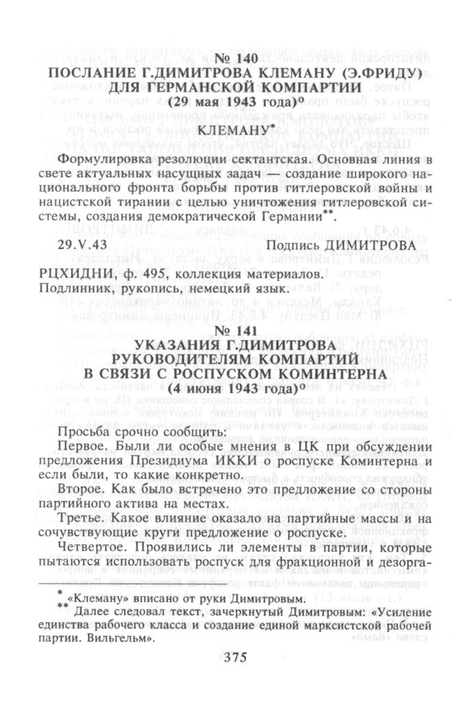 Указания Г.Димитрова руководителям компартий в связи с роспуском Коминтерна. 4 июня 1943 г. // РЦХИДНИ. Ф. 495, коллекция материалов. Подлинник, машинопись, русский язык.