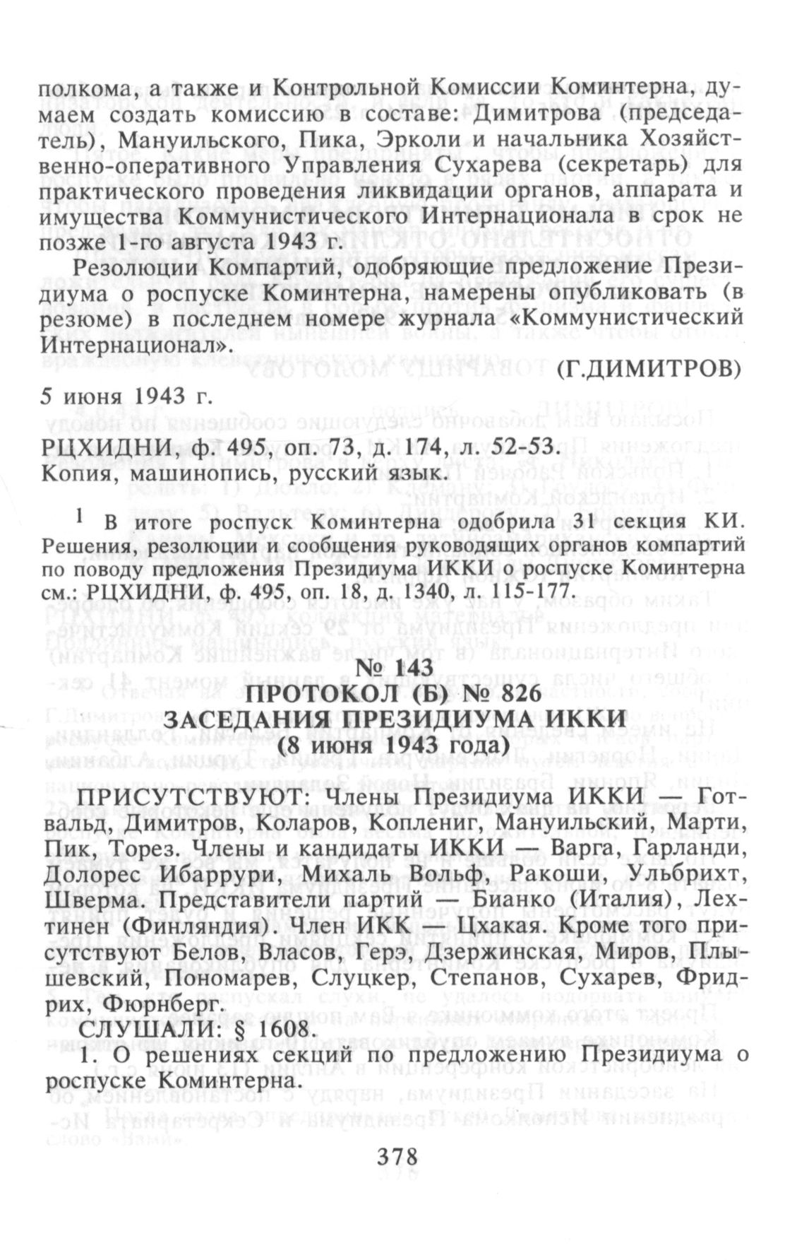 Протокол (Б) № 826 заседания Президиума ИККИ. 8 июня 1943 г. // РЦХИДНИ. Ф. 495, оп. 18, д. 1340, л. 106-107. Подлинник, машинопись, русский язык.