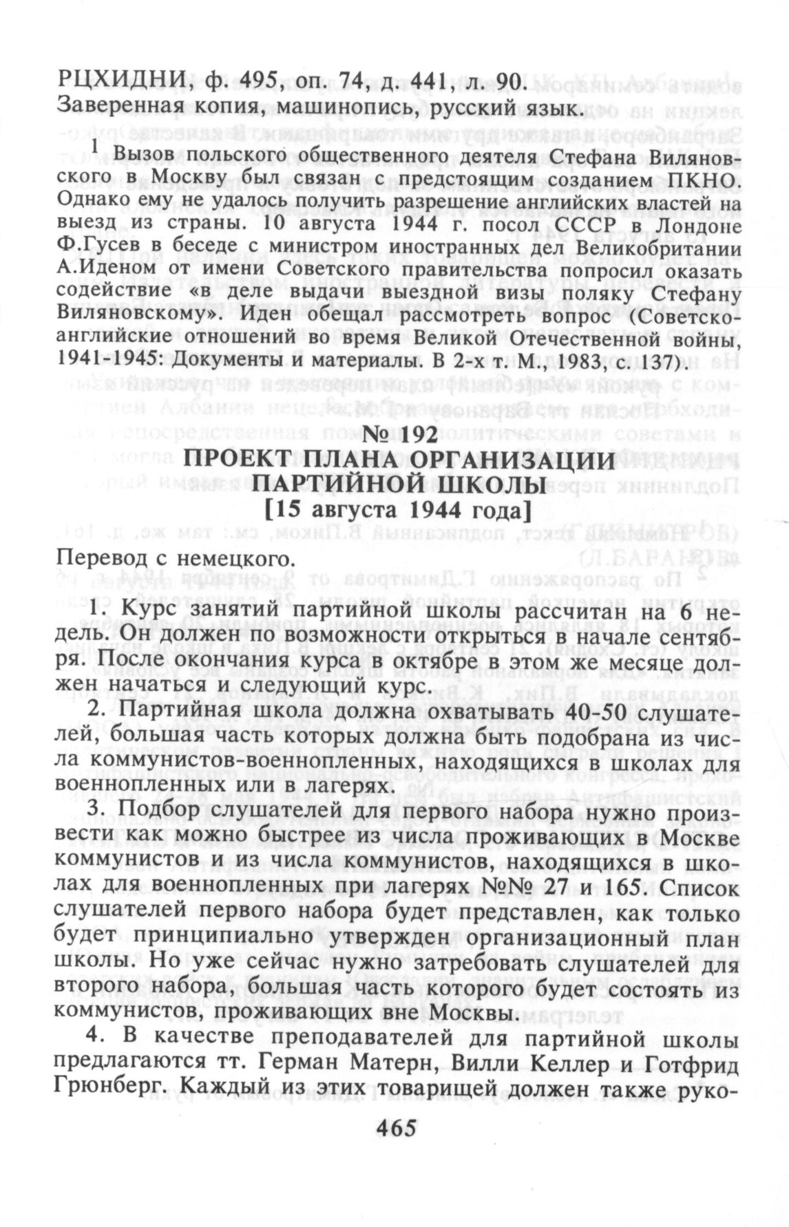 Проект плана организации партийной школы [15 августа 1944 г.] // РЦХИДНИ. Ф. 495, оп. 74, д. 161, л. 162. Подлинник перевода, машинопись, русский язык.