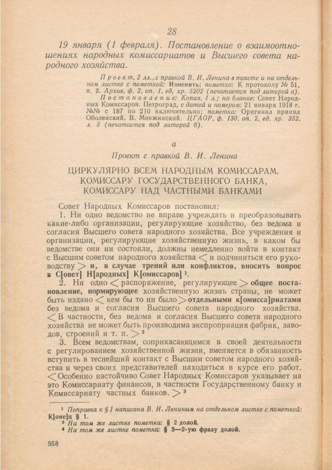 19 января (1 февраля). Постановление о взаимоотношениях народных комиссариатов и Высшего совета народного хозяйства // П р о е к т, 2 лл.,с правкой В. И. Ленина в тексте и на отдельном листке с пометкой: Изменить; пометка: К протоколу № 51, п. 2. Архив, ф. 2, оп. 1, ед. хр. 5202 (печатается под литерой а). П о с т а н о в л е н и е : Копия, 1 л.; на бланке: Совет Народных Комиссаров. Петроград, с датой и номером: 21 января 1918 г. №№ с 187 по 210 включительно: пометка: Оригинал принял Оболенский. В. Менжинский. ЦГАОР, ф. 130, оп. 2, ед. хр. 352, л. 5 (печатается под литерой б).