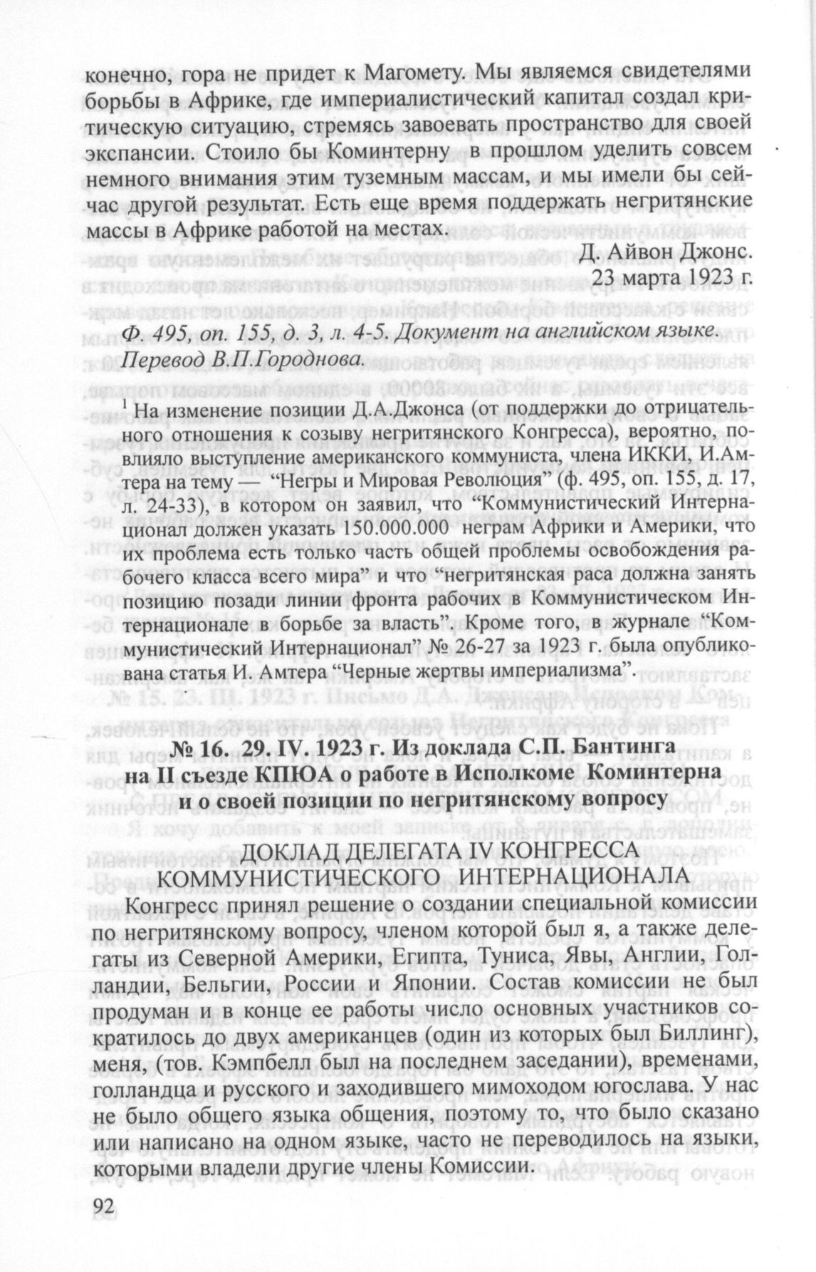 Из доклада С.П. Бантинга на II съезде КПЮА о работе в Исполкоме Коминтерна и о своей позиции по негритянскому вопросу. 29 IV. 1923 г. // РГАСПИ, ф 495, oп. 64, д.16, л. 26-27. Документ на английском языке. Перевод В.П. Городнова.