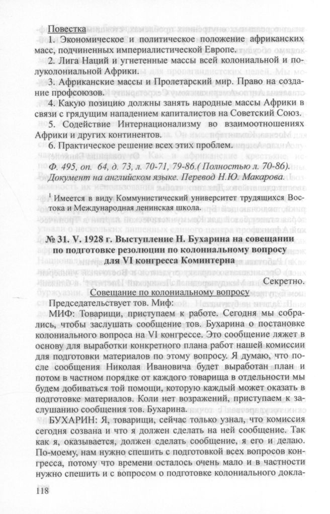 Выступление Н. Бухарина на совещании по подготовке резолюции по колониальному вопросу для VI конгресса Коминтерна. V. 1928 г. // РГАСПИ, Ф. 495, oп .60, д. 138, л. 2-12. Полная стенограмма совещания там же, л.2-31. Документ на русском языке.