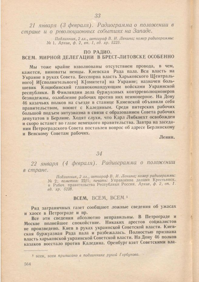 Главная Серия «Экономическая история. Документы, исследования, переводы» Декреты советской власти в 18 т. Декреты Советской власти. Т. I. 25 октября 1917 г. – 16 марта 1918 г. Документы 21 января (3 февраля). Радиограмма о положении в стране и о революц...