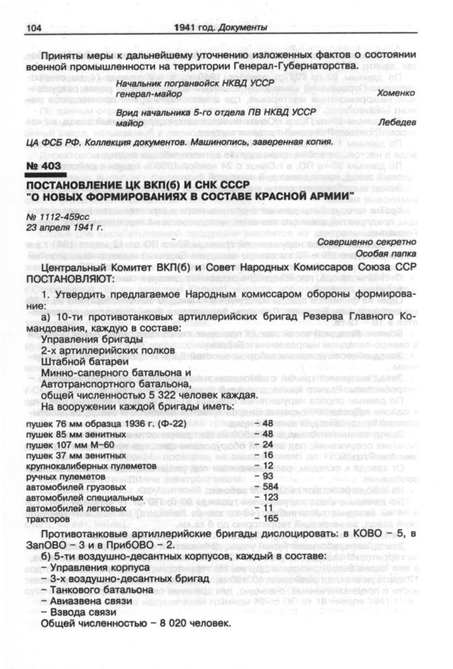 Постановление ЦК ВКП(б) и СНК СССР "О новых формированиях в составе Красной Армии". 23 апреля 1941 г.