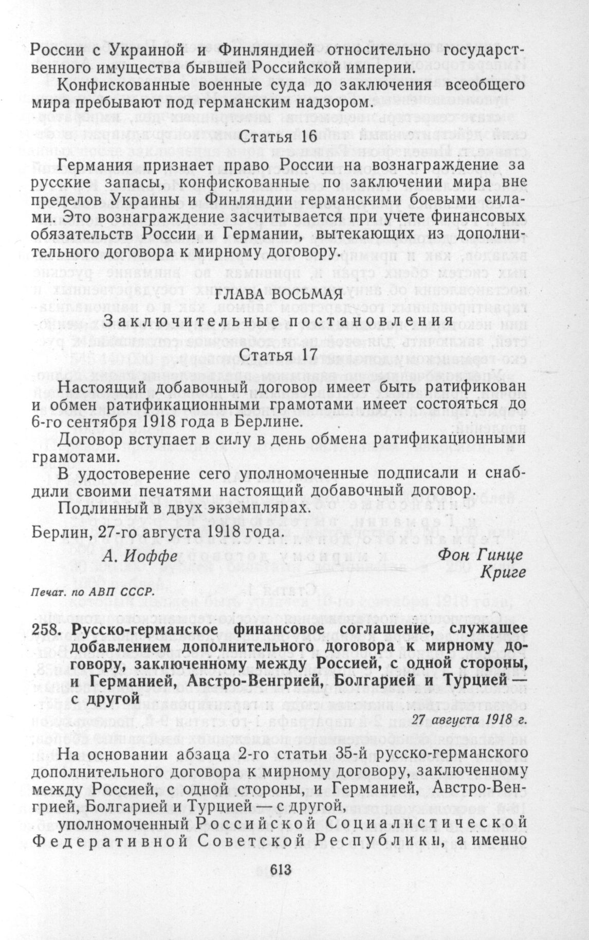 Русско-германское финансовое соглашение, служащее добавлением дополнительного договора к мирному договору, заключенному между Россией, с одной стороны, и Германией, Австро-Венгрией, Болгарией и Турцией — с другой. 27 августа 1918 г. // Печат. по АВП СССР.