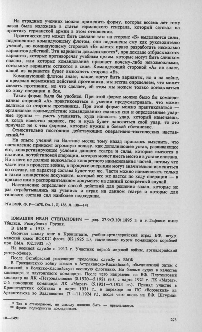 Сбор командующих флотов и флотилий по обобщению опыта войны и итогов боевой подготовки за 1940 год. Выступление по докладу И.С. Исакова. И.С. Юмашев, вице-адмирал, командующий Тихоокеанским флотом // РГА ВМФ, Ф. Р—1678, Oп. 1, Д. 186, Л. 148—165.