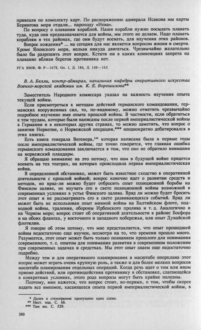 Сбор командующих флотов и флотилий по обобщению опыта войны и итогов боевой подготовки за 1940 год. Выступление по докладу И.С. Исакова. В.А. Белли, контр-адмирал, начальник кафедры оперативного искусства Военно-морской академии им. К.Е. Ворошилова // РГА ВМФ, Ф. Р—1678, Oп. 1, Д. 186, Л. 166—168.