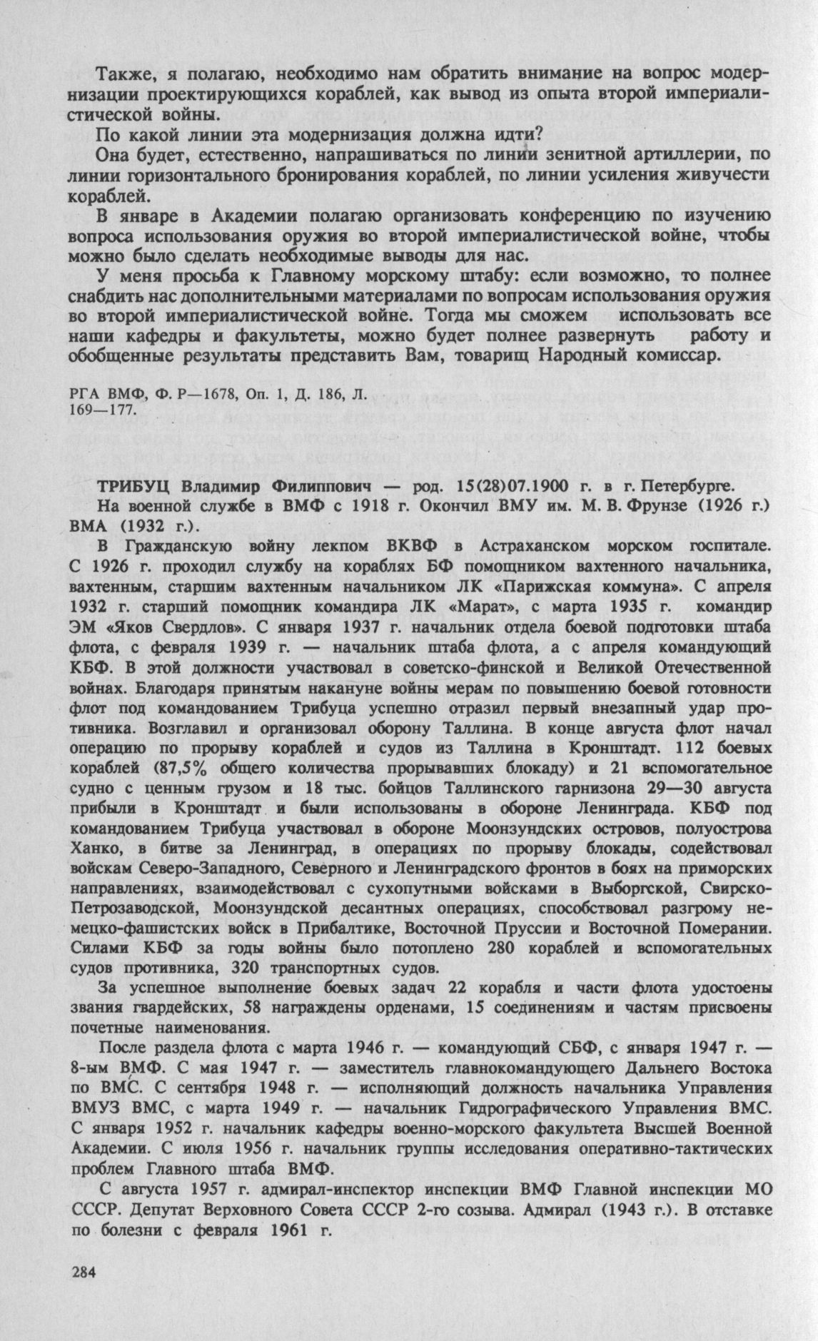 Сбор командующих флотов и флотилий по обобщению опыта войны и итогов боевой подготовки за 1940 год. Выступление по докладу И.С. Исакова. В.Ф. Трибуц, виде-адмирал, командующий Краснознаменным Балтийским флотом // РГА ВМФ, Ф. Р—1678, Oп. 1, Д. 186, Л. 178—191.