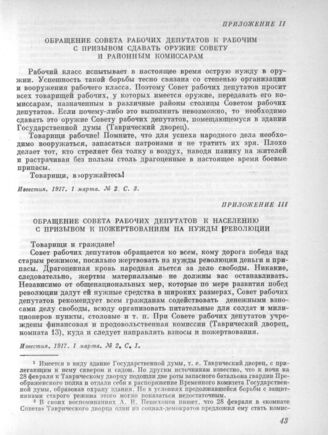 28 февраля. II. Общее собрание. Приложение. Обращение Совета рабочих депутатов к рабочим с призывом сдать оружие Совету и районным комиссарам // Известия. 1917. 1 марта. № 2. С. 3.