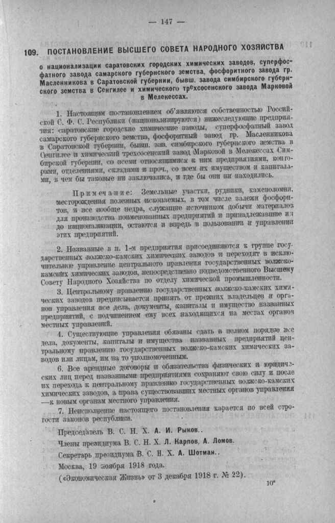 Постановление Высшего Совета Народного Хозяйства о национализации саратовских городских химических заводов, суперфосфатного завода самарского губернского земства, фосфоритного завода гр. Масленникова в Саратовской губернии, бывш. завода симбирского губернского земства в Сенгилее и Химического Трехсосенского завода Марковой в Мелекессах. Москва, 19 ноября 1918 г. // Экономическая Жизнь от 3 декабря 1918 г. № 22.
