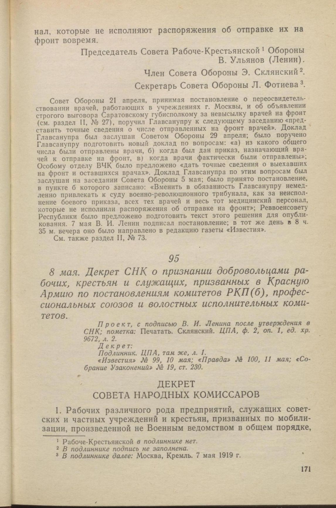 8 мая. Декрет СНК о признании добровольцами ра­бочих, крестьян и служащих, призванных в Красную Армию по постановлениям комитетов РКП(б), профес­сиональных союзов и волостных исполнительных коми­тетов