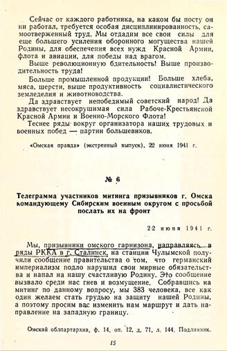 Телеграмма участников митинга призывников г. Омска командующему Сибирским военным округом с просьбой послать их на фронт. 22 июня 1941 г.