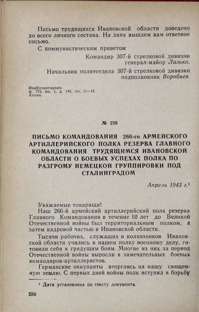 Письмо командования 266-го армейского артиллерийского полка резерва Главного Командования трудящимся Ивановской области о боевых успехах полка по разгрому немецкой группировки под Сталинградом. Апрель 1943 г. // Ивоблпартархив, ф. 773, оп. 1, д. 171, лл. 28—29. Подлинник.