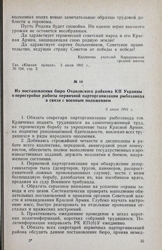 Из постановления бюро Очаковского райкома КП Украины о перестройке работы первичной парторганизации рыбозавода в связи с военным положением. 3 июля 1941 г.