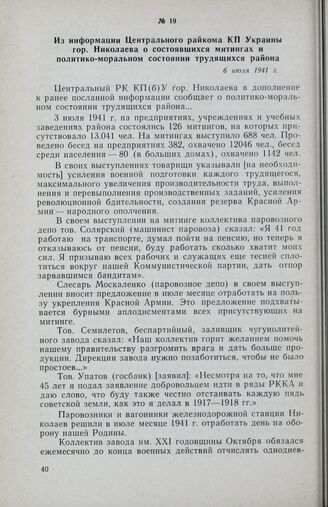 Из информации Центрального райкома КП Украины гор. Николаева о состоявшихся митингах и политико-моральном состоянии трудящихся района. 6 июля 1941 г. // Партархив Николаевского обкома КПУ, ф. 7, oп. 1, д. 346, лл. 92—93. Подлинник. //